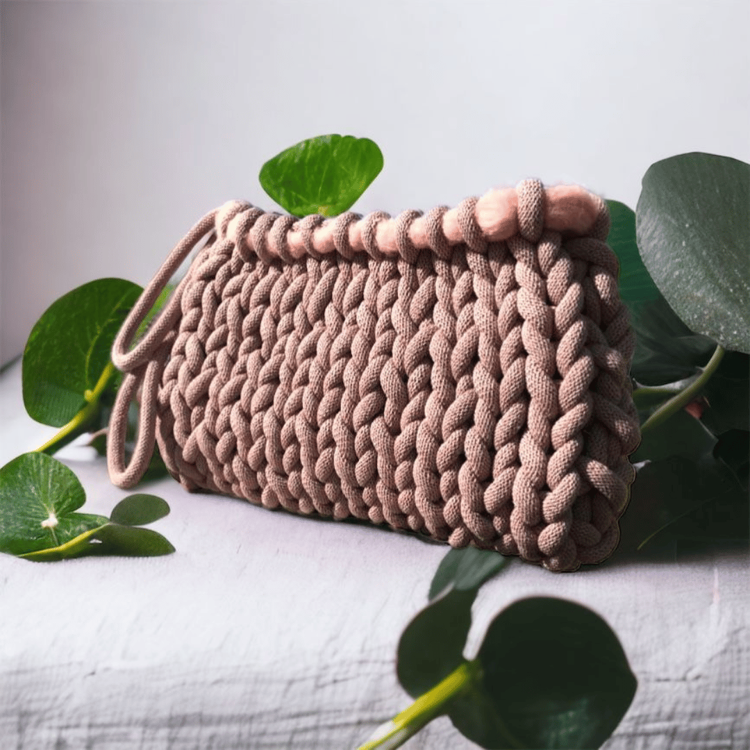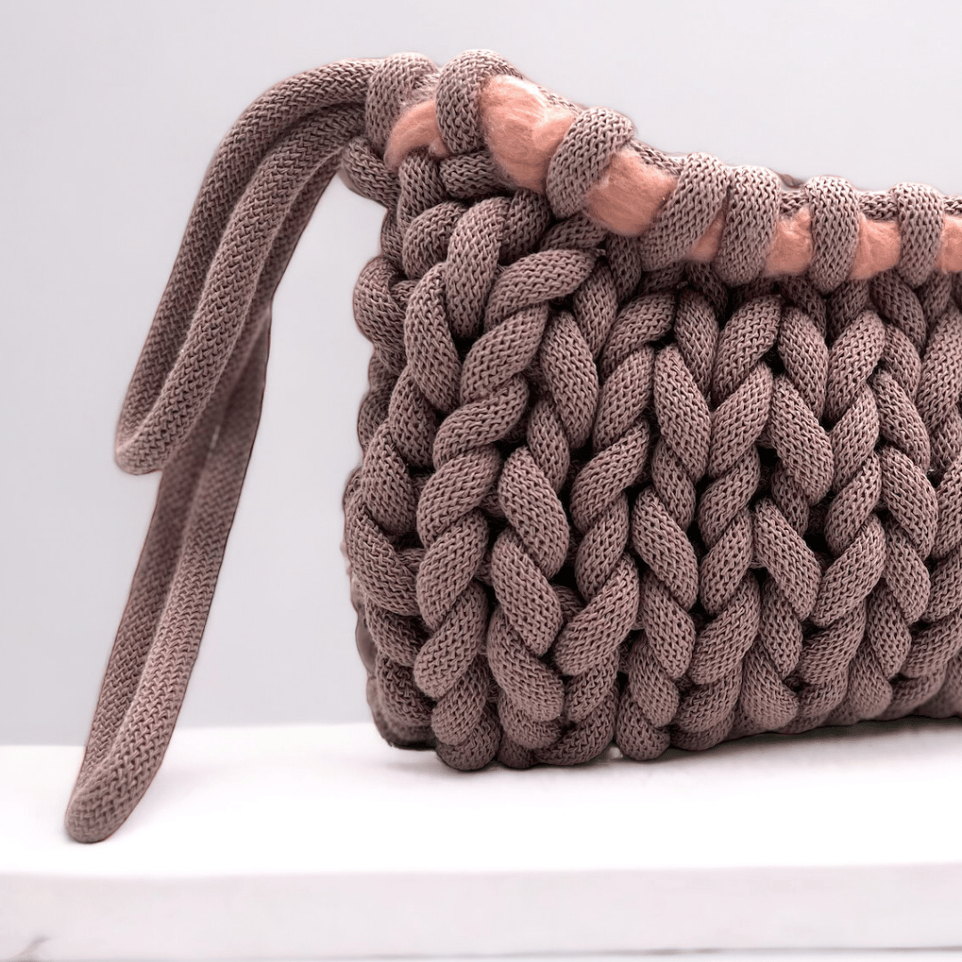 Borsa a mano tipo pochette realizzata in macramè, confezionata in cotone organico di colore cipria.