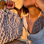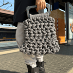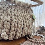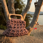Borsa in macramè realizzata in cotone organico, completa di fodera interna in cotone con tasca, senza zip.