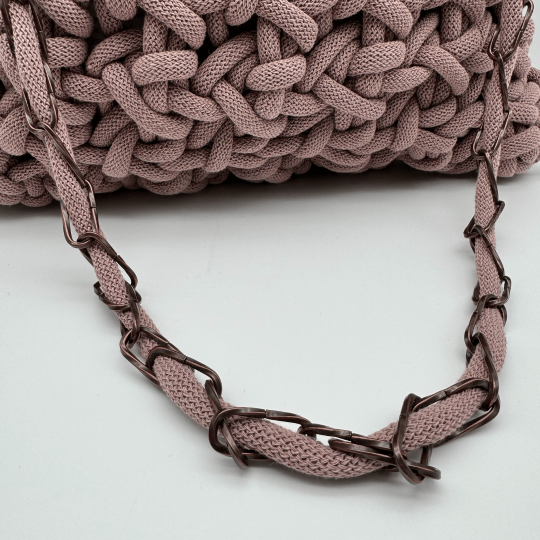 - Color Cipria con tracolla in catena zincata: larghezza 32 cm, lunghezza 29 cm, manico 9 cm, con fodera interna in cotone ecrù, manico in legno Wenge dipinto a mano.