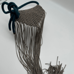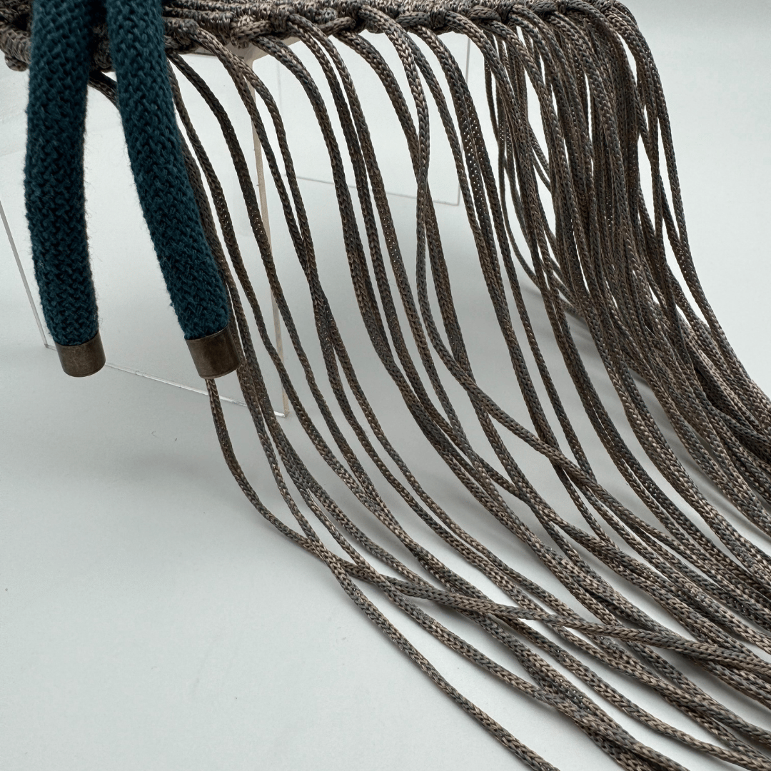 I fili in toni terra e metallizzati, arricchiti da una finitura luminosa, si intrecciano in un design sofisticato grazie a 300 nodini lavorati con la tecnica del macramé.