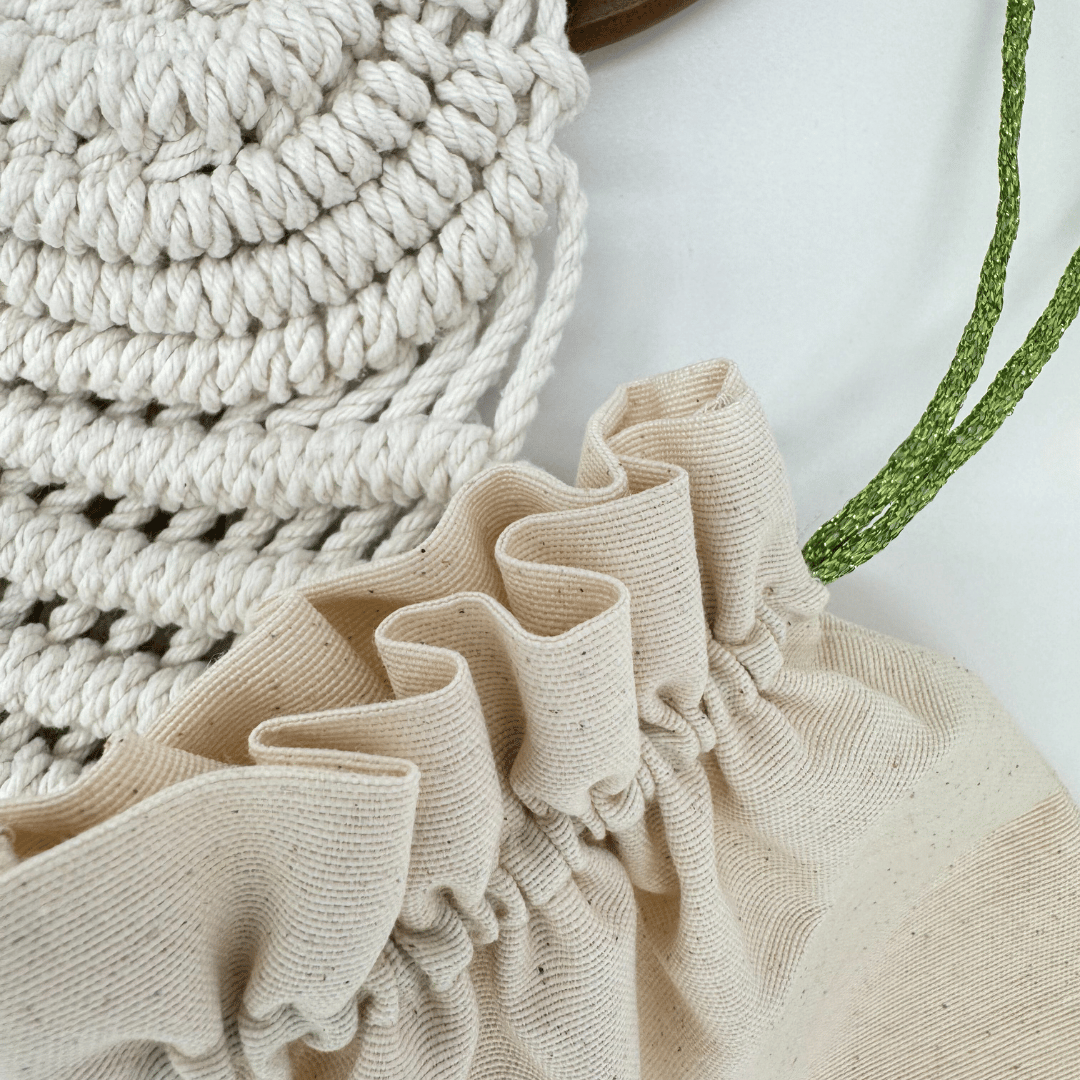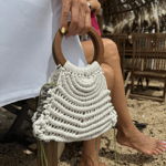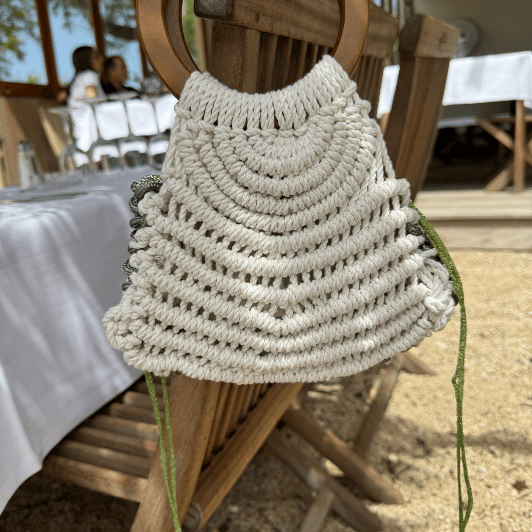 Borsa tessuta a mano con corde in cotone ecrù intrecciate con maestria nel macramé che evocano il movimento sinuoso delle onde del mare.