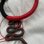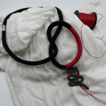 Ciondolo: Ceramica nera con elementi rossi dalla forma sinuosa, che cattura la luce e l'attenzione
