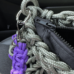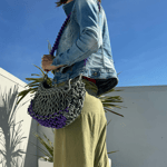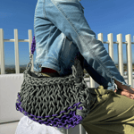 Borsa annodata a mano, creata con corde riciclate dalla plastica nei toni vivaci del verde oliva lunare e viola.