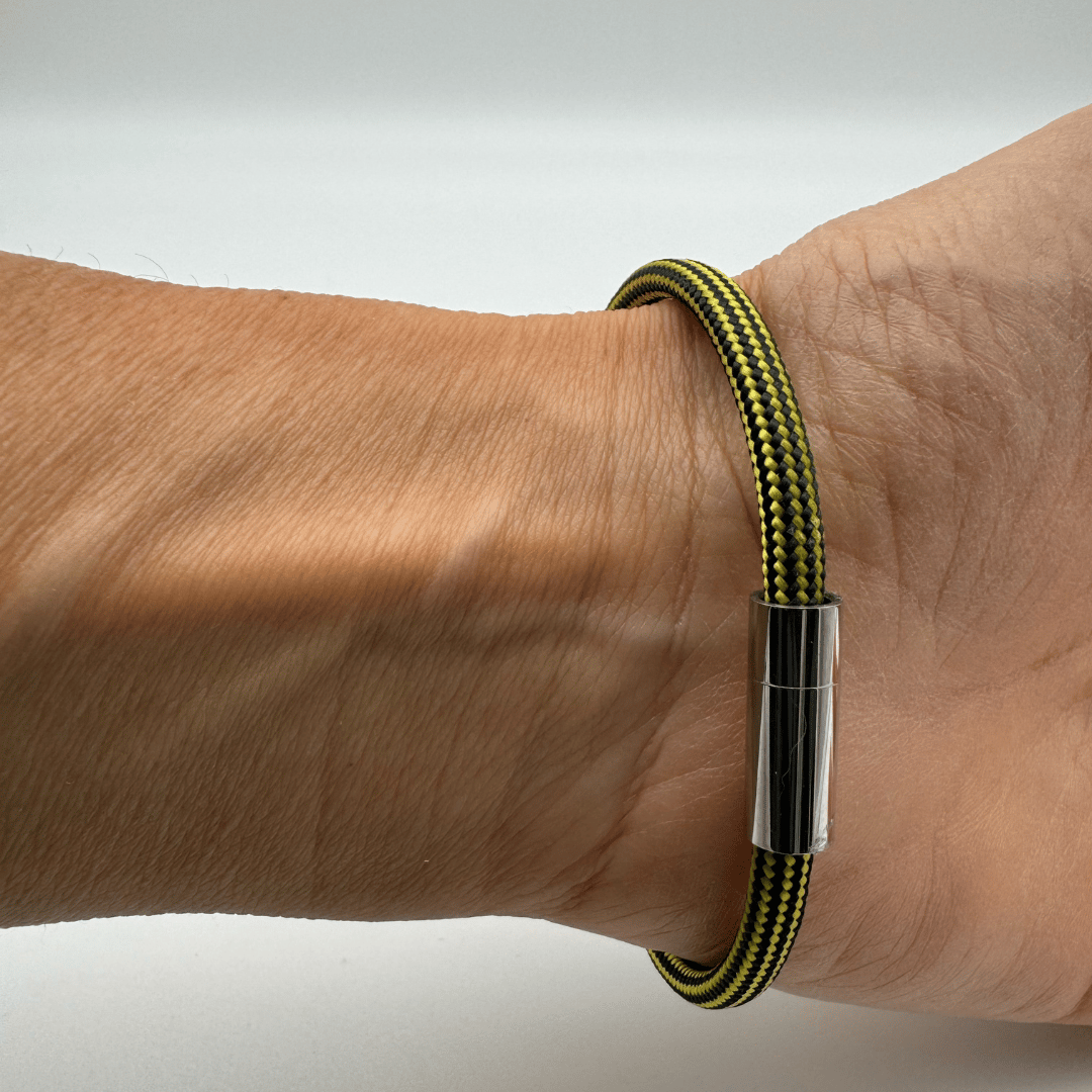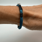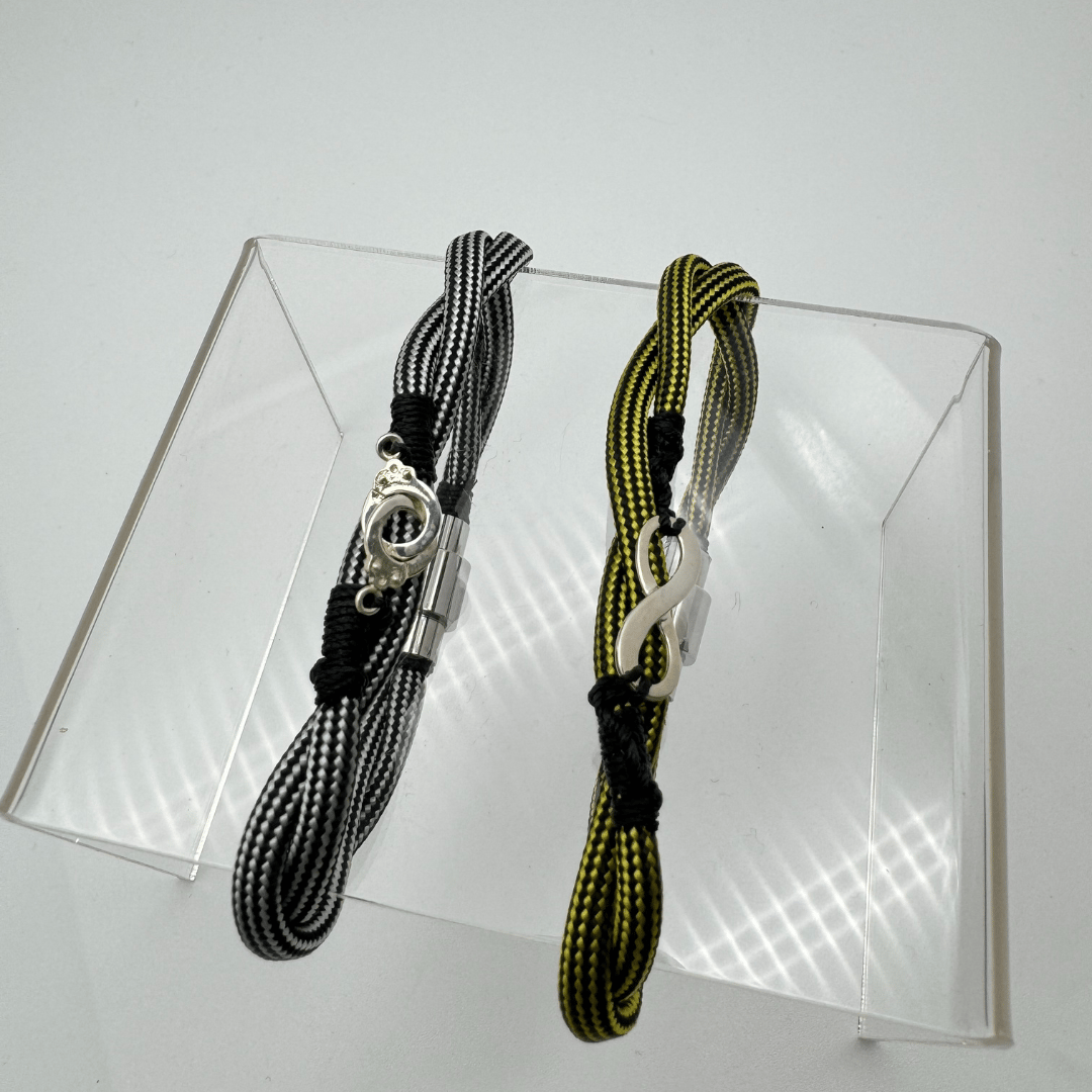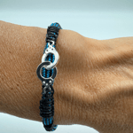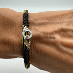 Un braccialetto con inserto a forma di manette in argento, completato da una pratica chiusura magnetica in acciaio.