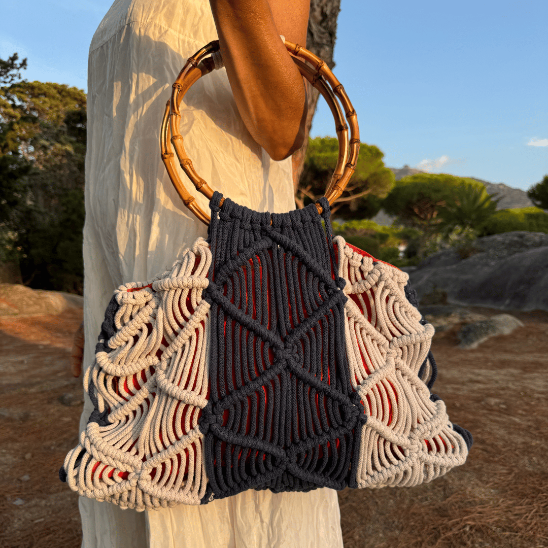 La combinazione di macramè e bambù crea un look naturale ma chic, mentre la fodera interna in cotone garantisce durata e praticità.