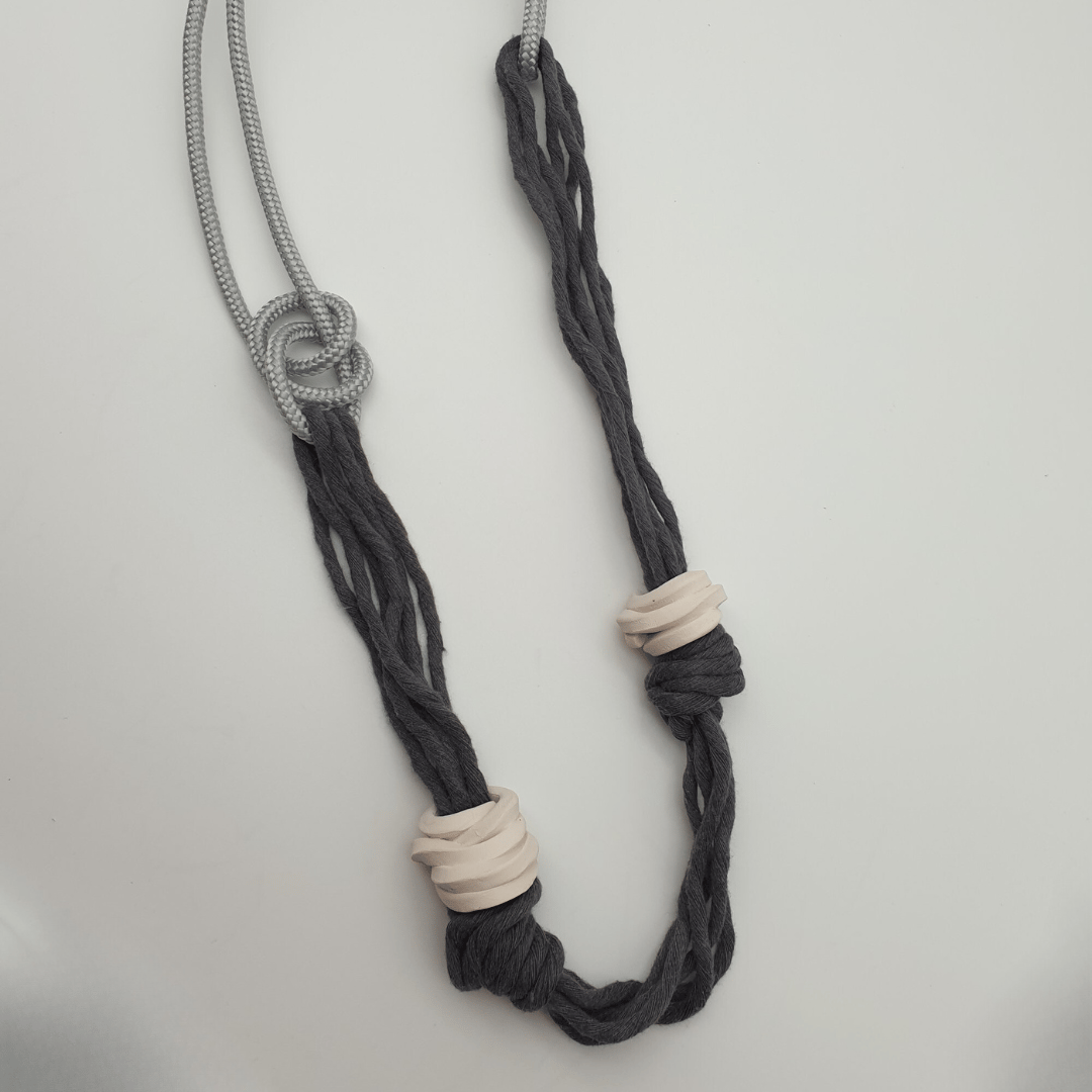 Ogni ciondolo è montato su fili intrecciati di cotone organico e fili riciclati dalla plastica, creando un effetto visivo intrigante.
